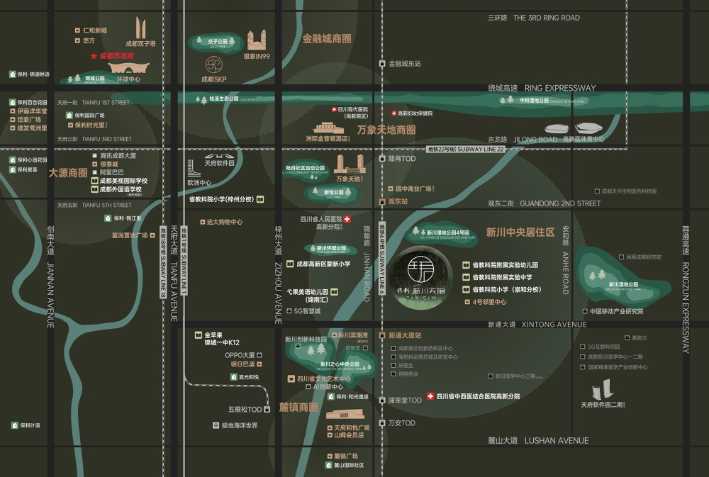 约500M内6号线新通大道站、观东站双地铁站,北达金融城三期、南抵天府CBD/西博城/兴隆湖等核心区,串连1号线号线(规划中)等地铁线路。